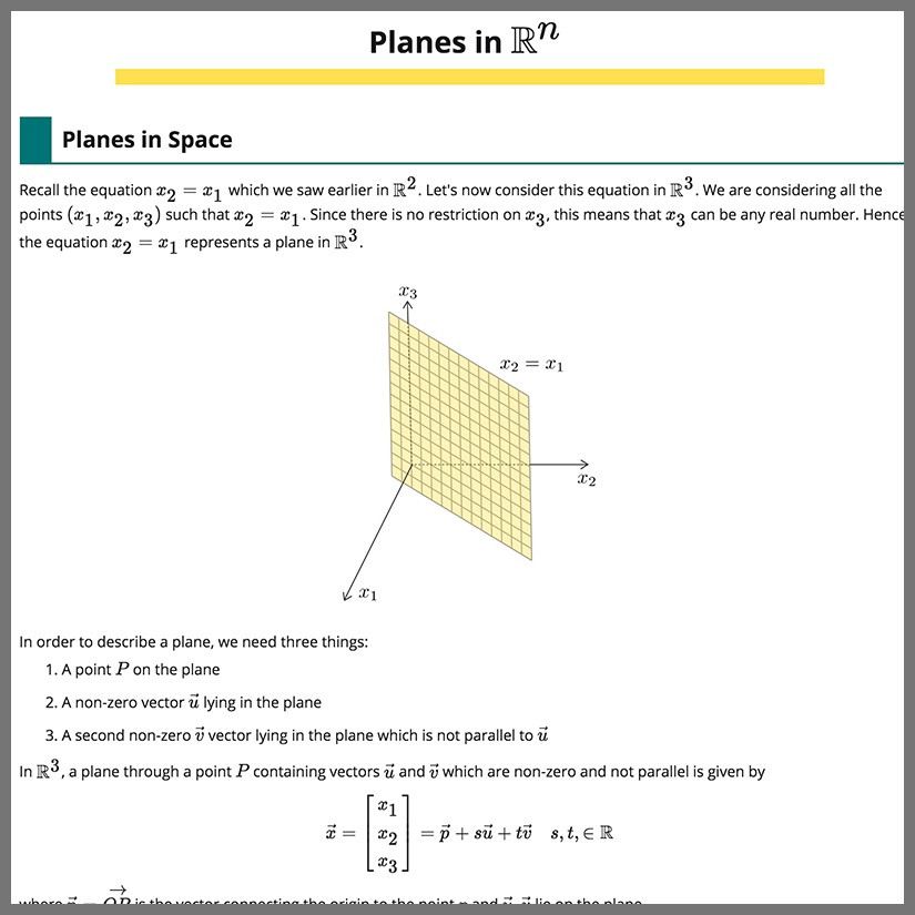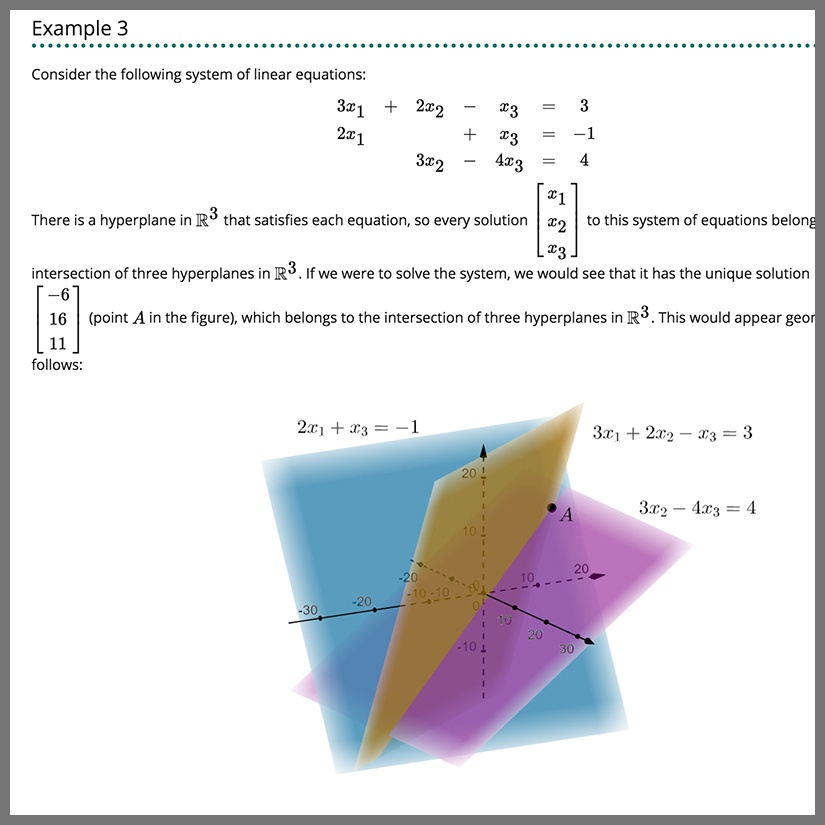 The Linear Algebra I Content Pack is a Möbius course developed by the University of Waterloo that you can use as a customizable starting point to a complete linear algebra course in Möbius. This Content Pack explores: systems of linear equations, matrix algebra, determinants, and introduces vector spaces and their applications. This customizable resource contains 9 units of sectioned lessons and assignments enhanced with Möbius capabilities including algorithmic questions, in-lesson questions with unlimited practice, adaptive questions, interactive narratives, Geogebra resources, hints and immediate feedback, and end-of-section assignments.