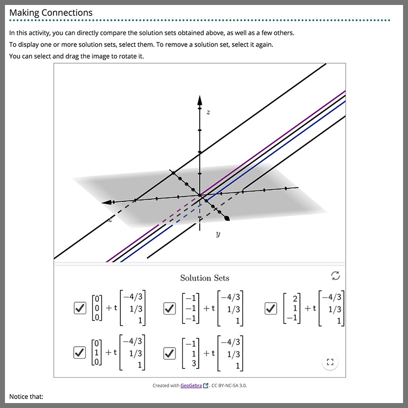 Lessons contain interactive elements like Interactive Narratives, HTML objects, Math Apps, or Geogebra applications to help solidify difficult STEM concepts.