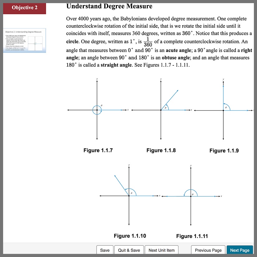The Trigonometry: A Unit Circle Approach that prepares for Calculus Content Pack is a trigonometry course presented using the unit circle approach that you can use as a customizable starting point to a complete college course in Möbius. This unit circle approach fits much better with the concept of functions. In addition, this approach allows most topics in trigonometry to be built upon the unit circle. This customizable resource contains 5 units of sectioned lessons and assignments enhanced with Möbius capabilities including algorithmic questions, embedded videos, and end-of-lesson quizzes. With a clear progression of concepts, it, along with our other text College Algebra: A Function Approach that prepares for Calculus, equip learners with the necessary tools to succeed in calculus and beyond.