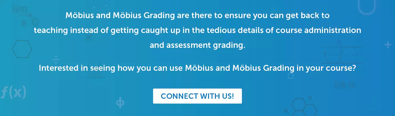 While Möbius and Möbius Grading bring time-saving automation and digitized workflows to course delivery, these tools can never replace the value that real people bring to the world of teaching, like ensuring context in content delivery, tracking and nurturing student progress, and bringing real-world examples to the digital or in-person classroom.