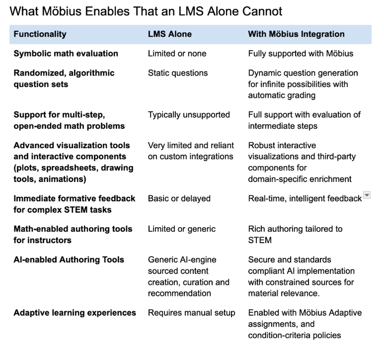 Möbius addresses these limitations by providing robust STEM domain-specific features that seamlessly integrate with your existing LMS: