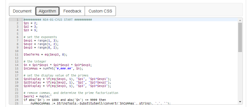 When you’re ready with your depot of static questions consisting of any combination of the 15 different question types, you can then leverage these static templates to propagate a limitless supply of algorithmic iterations. The Algorithm Designer offers helpful point-and-click algorithmic options, like “range”, but the Möbius Algorithm Editor enables you to craft your algorithmic code from scratch using a sizeable series of built-in algorithmic functions like “numfmt”, “rank”, “strcat”, “switch”, and many, many more.