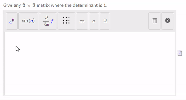 Maple-graded questions are backed by the world-class MapleTM mathematics engine that uses Maple code to define the grading logic. This is immensely powerful since open-ended questions and questions with multiple—and even infinite—correct answers can be produced. Ask questions online as if you were in front of your students in the classroom like, “Give an example of a function that has a maximum at x = 0” or “List two composite numbers that have no factors in common” or “Give any 2 x 2 matrix where the determinant is 1”.