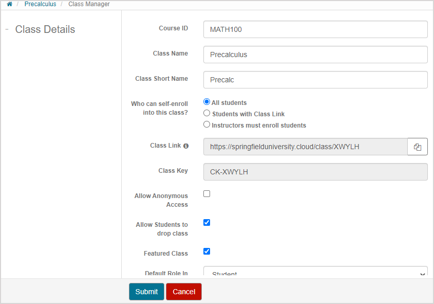 - Edit — Be navigated to the Edit Class Details page.