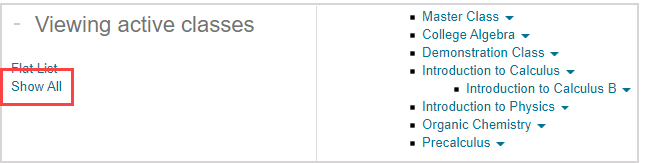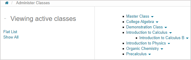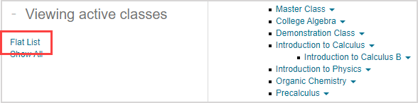 TIP: Click Flat List to view your organization's classes with the Flat List view. You can then perform a class search from the Flat List view. Check out Search for a class (administrator).