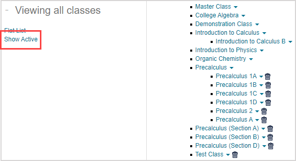 - Delete — Delete the class from the list of active classes.