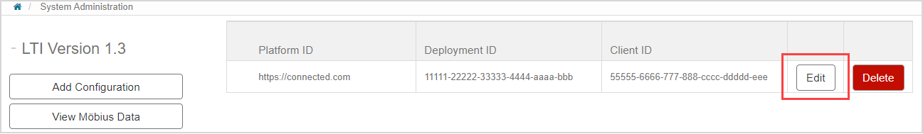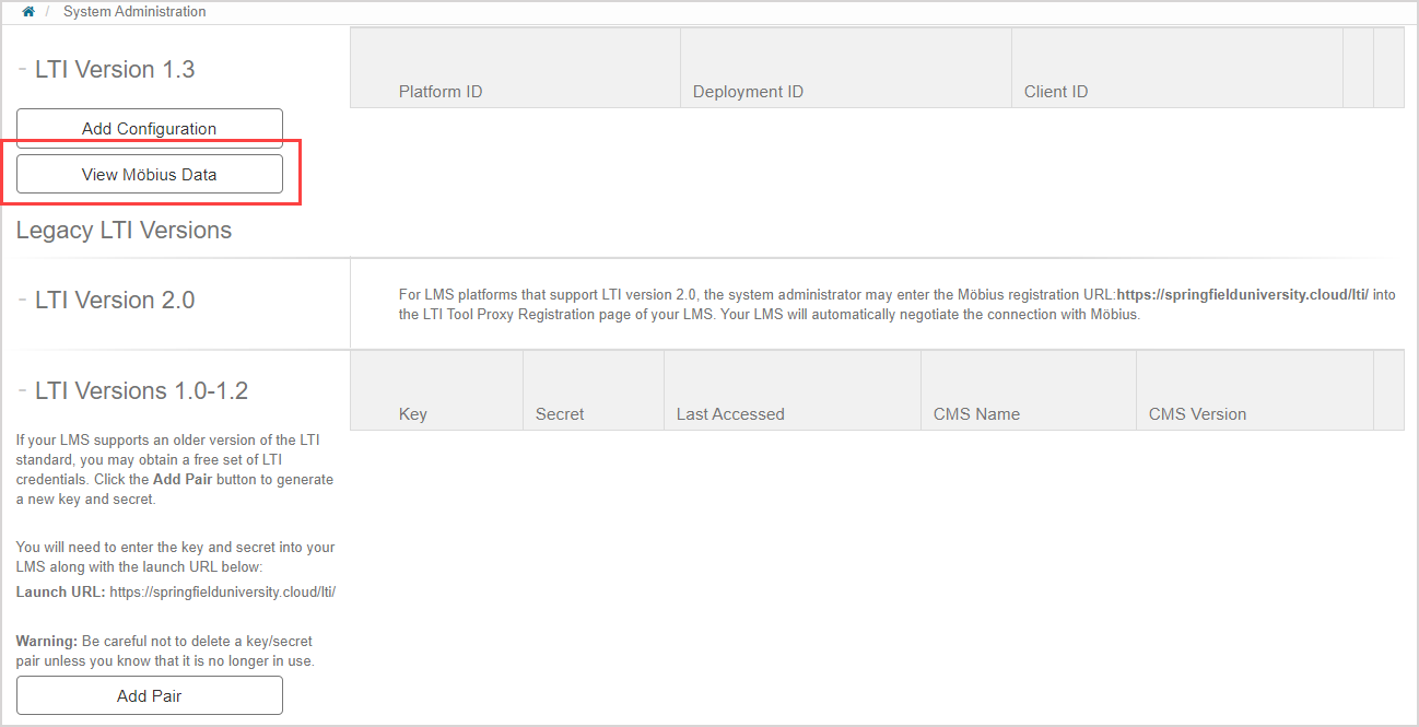 1. Click View Möbius Data in the LTI Version 1.3 pane.