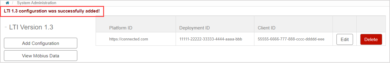 1. Once complete, the LMS will provide you with the Platform ID and the Deployment ID, which are required to complete the LTI configuration within Möbius.