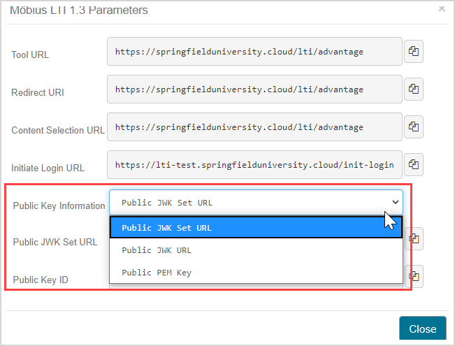 Under Mobius LTI 1.3 Parameters , the Public Key Information drop-down menu is highlighted.