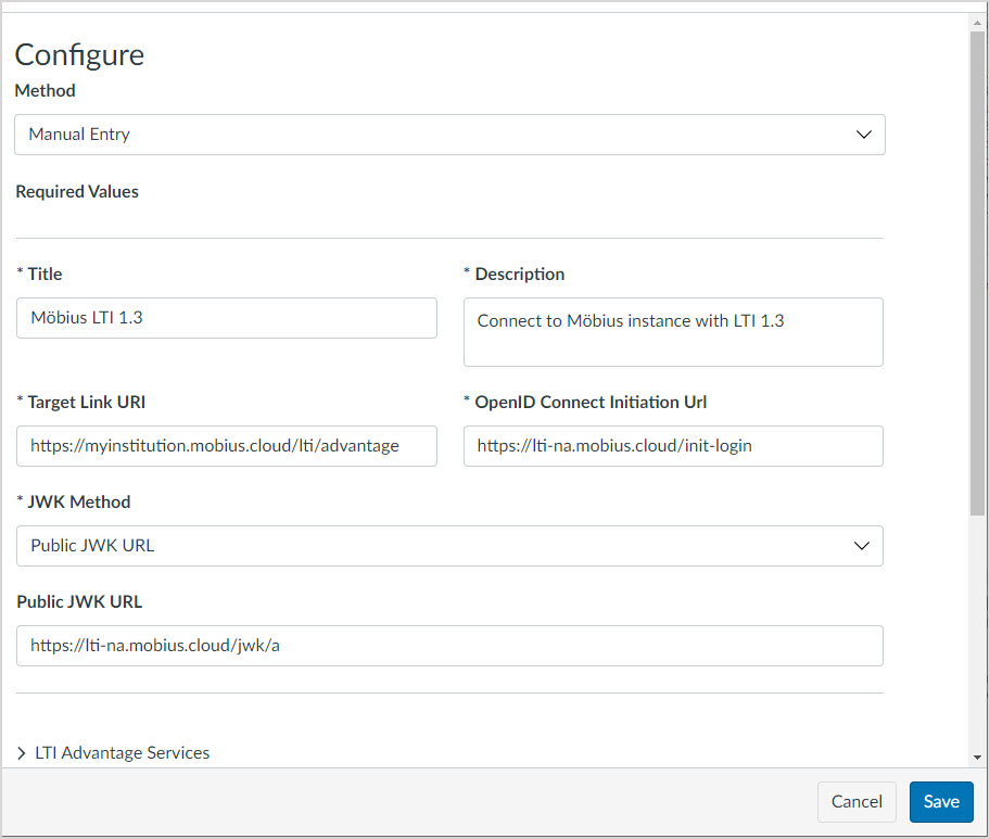 • Public JWK URL: Enter the Public JWK URL value attained from View my Möbius LTI data.