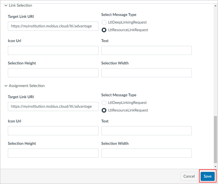 • Target Link URI: Enter the Content Selection URL value attained from View my Möbius LTI data.