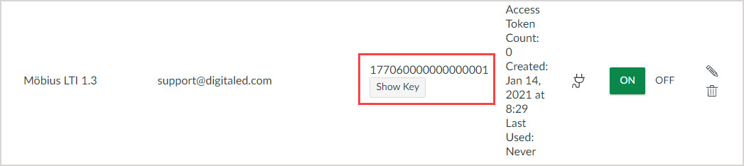 1. Your new LTI key will be displayed on the Developer Keys page. Click ON to turn on the LTI key.