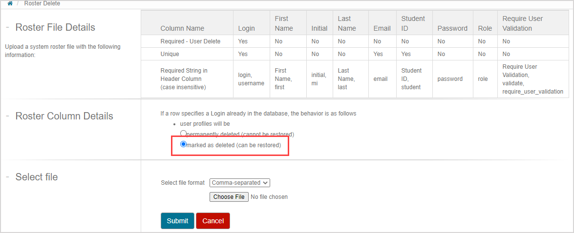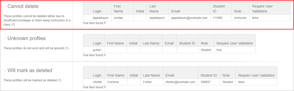 NOTE: Users can't be deleted if they're enrolled as an instructor in a class or you don't have the permissions required to delete users. Users that can't be deleted from your user roster file are listed in the Cannot delete pane.