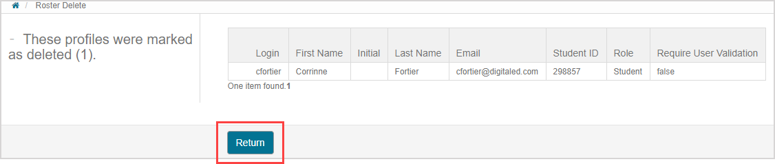 A confirmation summary is displayed of the users that were successfully deleted using the user roster file. Click Return to be navigated back to the user search page.
