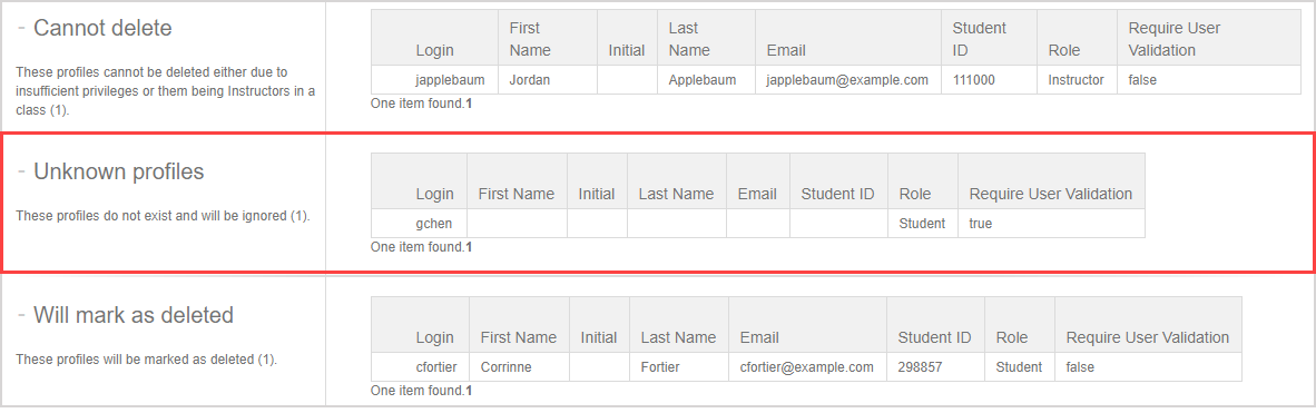 Users from the user roster file that Möbius couldn't find in the database are considered unknown and won't be deleted (Example — perhaps they don't have a Möbius account or there's a typo in the user login that's defined in the user roster file). These users that Möbius considers unknown are listed in the Unknown profiles pane.