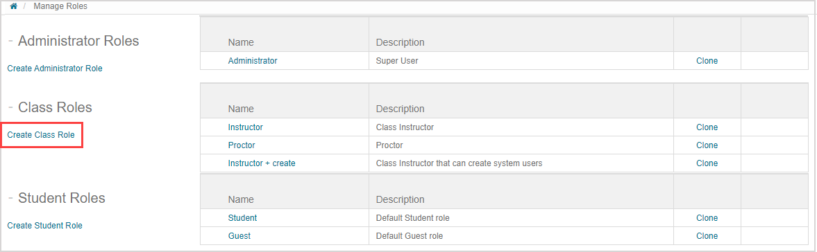 1. Click Create Administrator Role, Create Class Role, or Create Student Role depending on your decision from step 1.