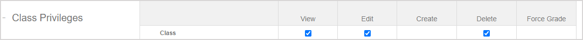 The Class Privileges table is shown; in Class row the checkboxes for View, Edit, and Delete are checked.