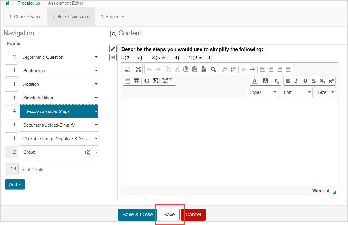 Navigate to the 2. Select Questions tab of the assignment's Assignment Editor.