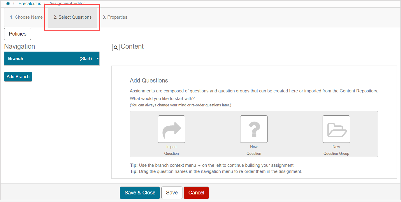 Navigate to the 2. Select Questions tab of the Assignment Editor.