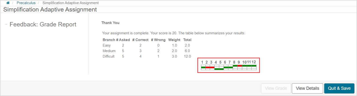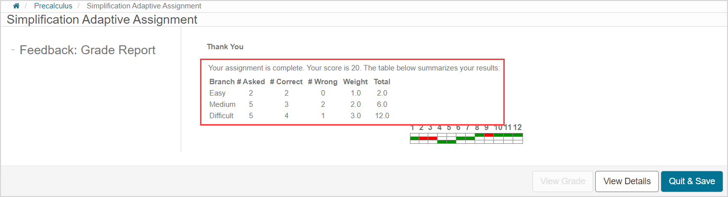 NOTE: The progress graph will also appear when the student reviews their branch performance summary and overall score on the adaptive assignment Grade Report page after exiting their attempt.