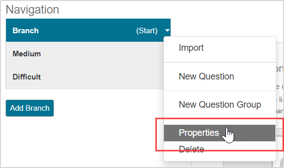Question branches are commonly based on difficulty level (Example — easy, medium, and difficult) to identify student knowledge levels but can be designed using other types of categories instead (Example — concepts or topics).