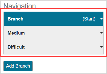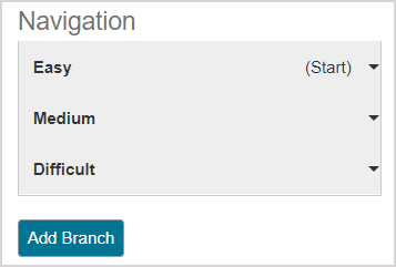 By default, branches are assumed to be based on difficulty level (Example — easy, medium, and difficult) and the student is navigated through them in a linear path (Example — the student starts with the easy branch and is navigated to the medium and then difficult branches, respectively).