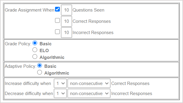 | Adaptive policy | Basic adaptive policy — The adaptive assignment's branch difficulty is increased after 1 correct response is entered and decreased after 1 incorrect response is entered. |