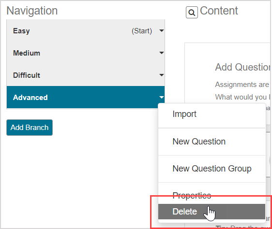 IMPORTANT: Deleting a branch also deletes all questions contained within the branch from the adaptive assignment. However, these questions are preserved within your Content Repository.