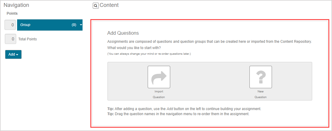 NOTE: Assigning individual questions (either existing questions that you've imported into the question group or new questions that you've authored specifically for the question group while in the Assignment Editor) to the question group only remain within the question group for this assignment. The Content Repository doesn't maintain question groups when they're created from within the Assignment Editor. Check out Create a group to create groups of content that are maintained in the Content Repository.