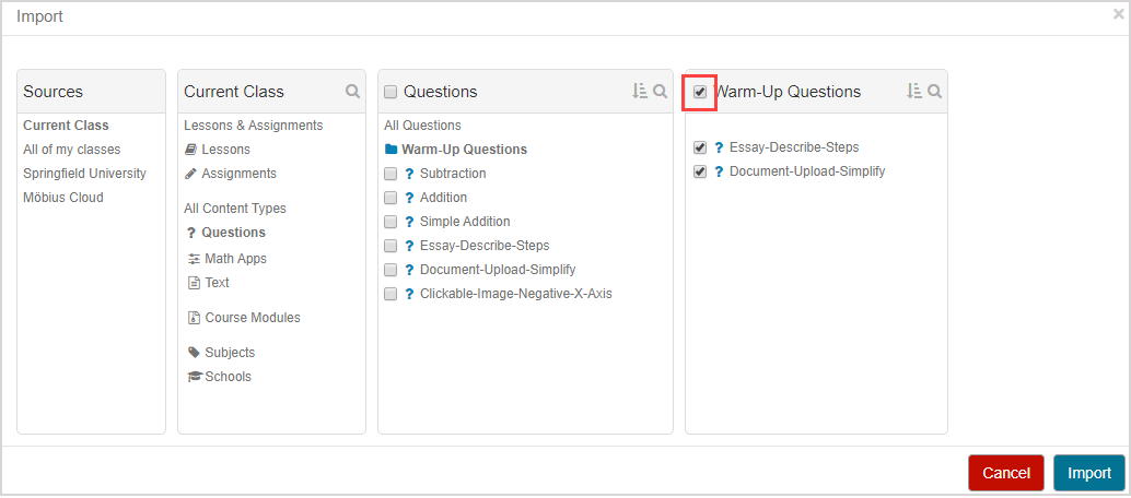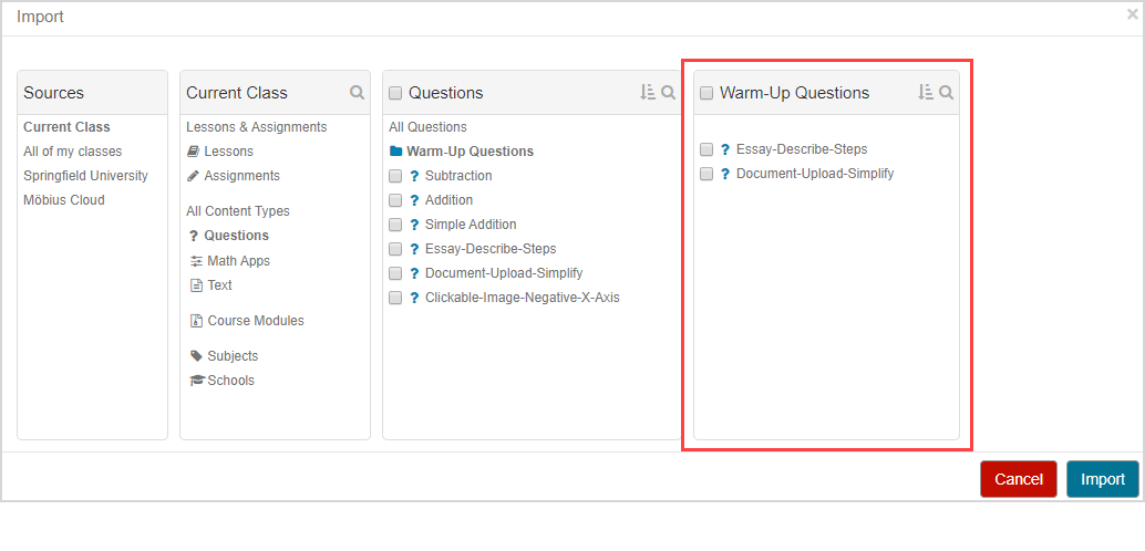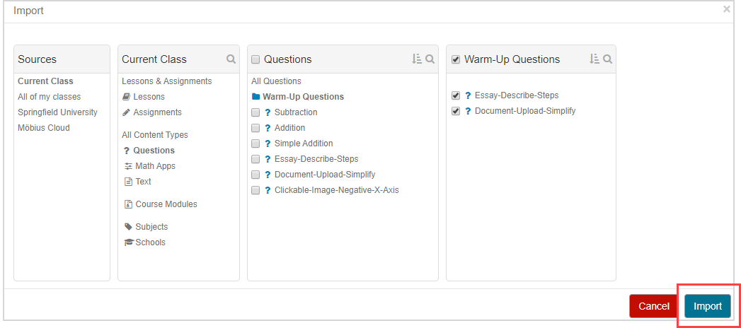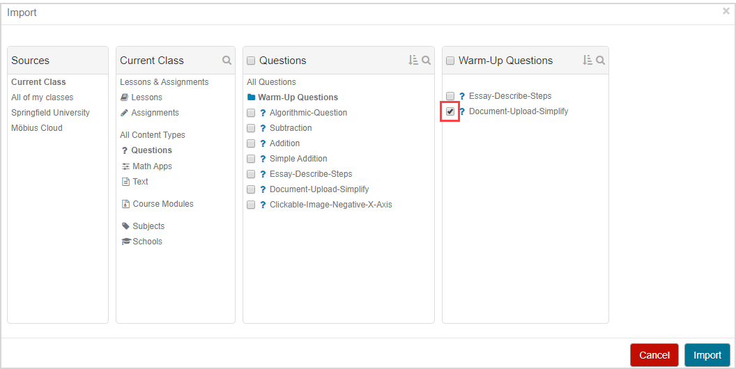 - Choose to import existing content from your Content Repository (Example — questions, question groups, text, or Math Apps)..