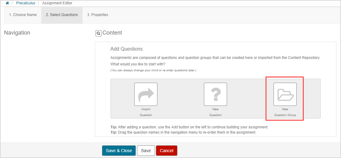 NOTE: Creating a new question group from within the Assignment Editor means that the question group is only available to the assignment you're adding it to. Any individual questions (either existing questions that you've imported into the question group or new questions that you've authored specifically for the question group while in the Assignment Editor) will be available through the Content Repository, but not as the question group that you created within the Assignment Editor.