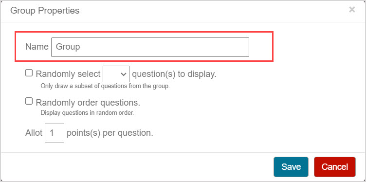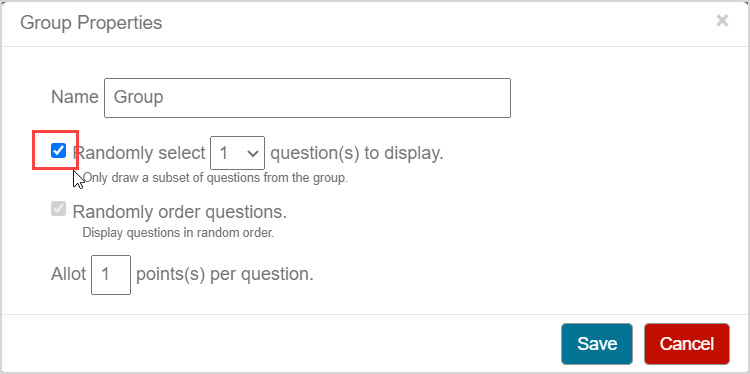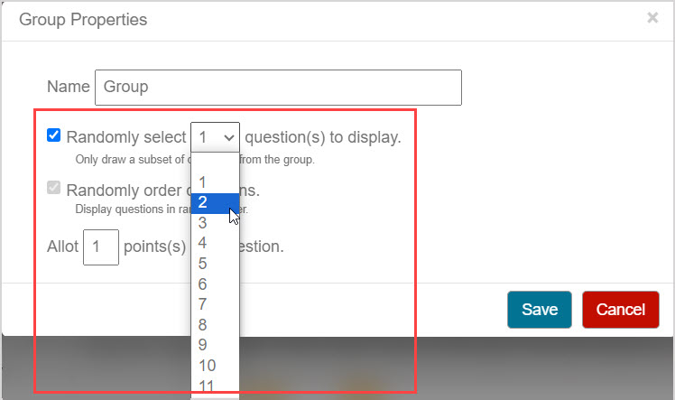 If the Randomly select n question(s) to display check box is selected, use the drop-down list to select the number of questions that will be randomly chosen as a subset from the question group.