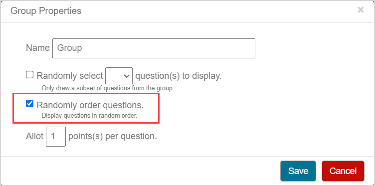 Select the Randomly order questions check box (checked by default) to randomize the order in which questions within the question group are displayed in an assignment attempt.