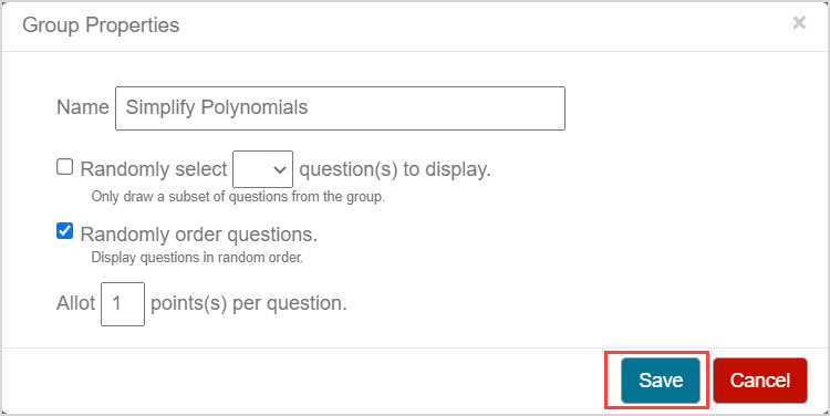 NOTE: If Randomly order questions is selected for a question group, but the Randomly order assignment property is set to Never (check out Define assignment properties), then the order of questions throughout the assignment will match the order in the Assignment Editor, except for when it comes to the question group.
