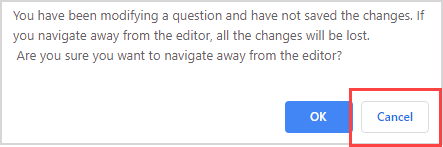 . Your edits to questions will not be saved without clicking this icon. If you fail to click this icon before leaving the Question Editor, a warning message will appear stating that your changes will not be saved. Click Cancel to return to the Question Editor and then click the save icon