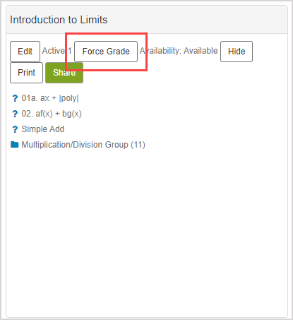 If a student has an active attempt at the assignment, you will not be able to edit that student's assignment version in the Assignment Editor. Click Force Grade in the Content Repository to have access to that version of the assignment to edit. However, Force Grade will submit the student's attempt. The Force Grade button is only visible if there are active attempts by students. Check out Force grade an activity.
