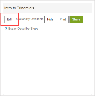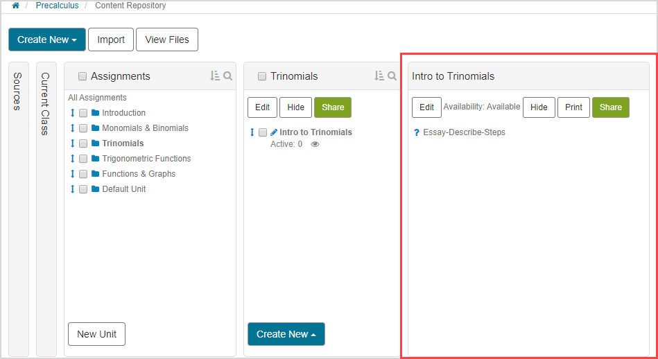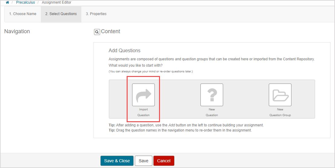 TIP: Questions from the Questions pane are generally the type of content that's imported into an assignment from the Content Repository. You can also import Math Apps from the Math Apps pane and text from the Text pane of your Content Repository into your assignment.
