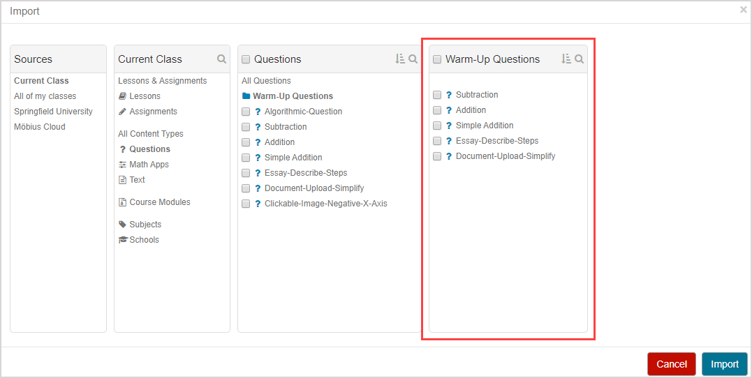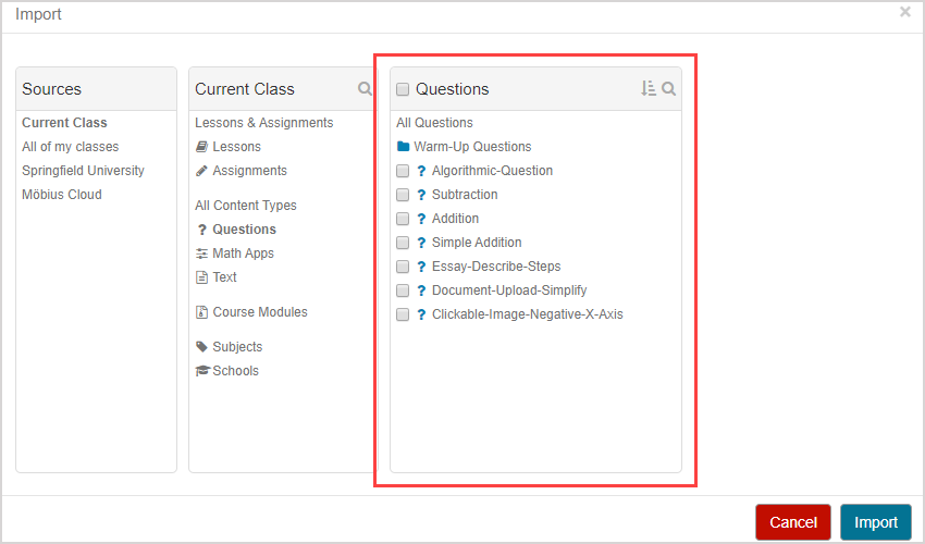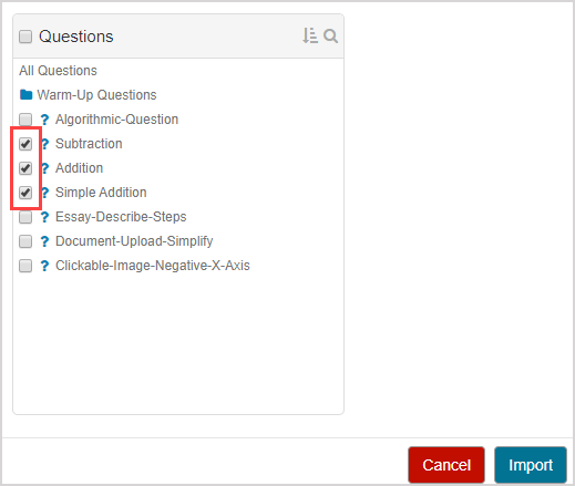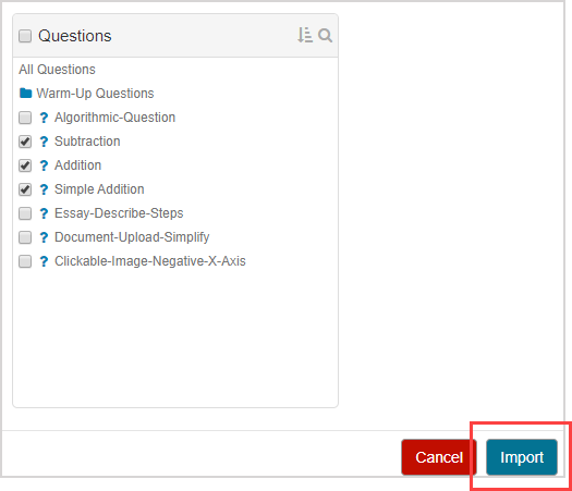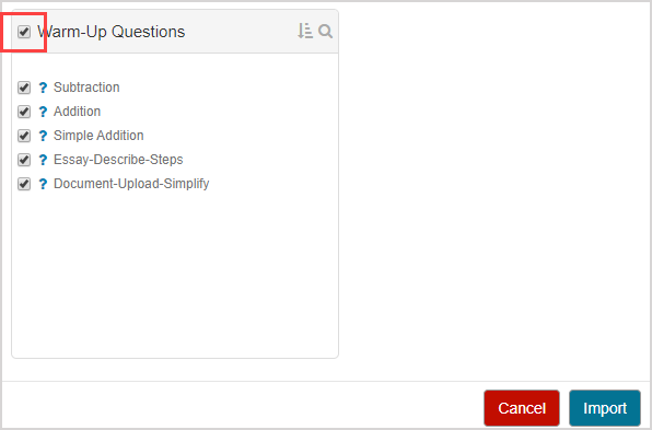 TIP: Click Import Question in the Add Questions pane if you're importing questions into an empty assignment and then resume at step 6 of Import assignment questions.