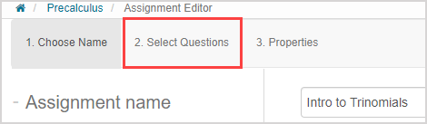 Existing questions can be imported from your Content Repository into an assignment using the Select Questions tab of the Assignment Editor.