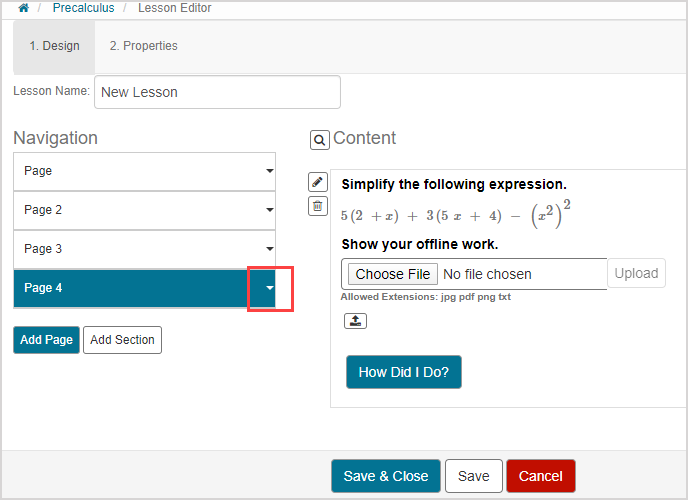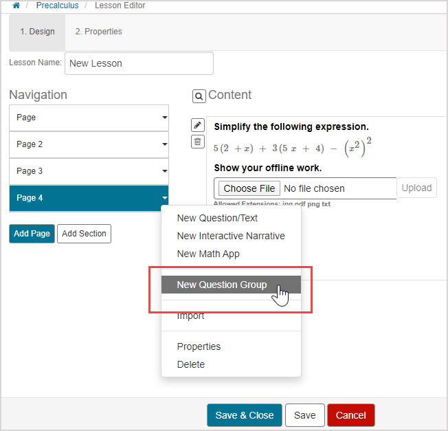 1.  Select the page of the lesson that you want to add a question group to from the Navigation pane of the Lesson Editor's Design tab..