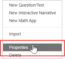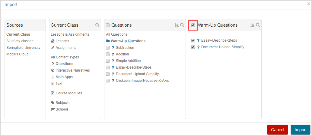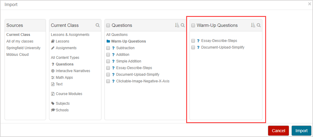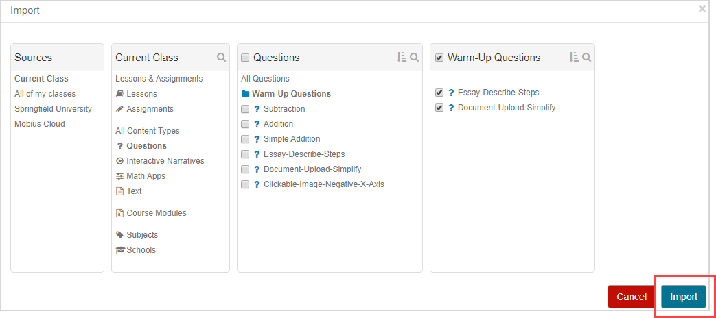 • Or, choose to import existing content from your Content Repository (Example — questions, question groups, text, Interactive Narratives, or Math Apps).