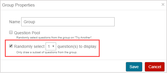 • Select the Randomly select n question(s) to display check box to only display a specified subset of questions from the question group.