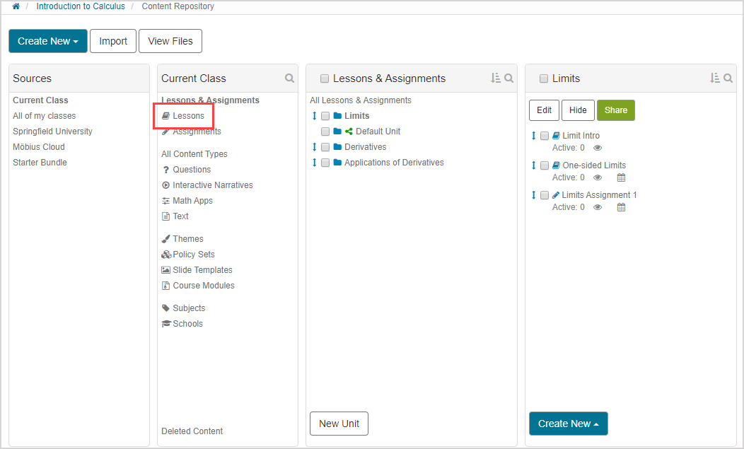 Click Lessons in the Current Class pane.