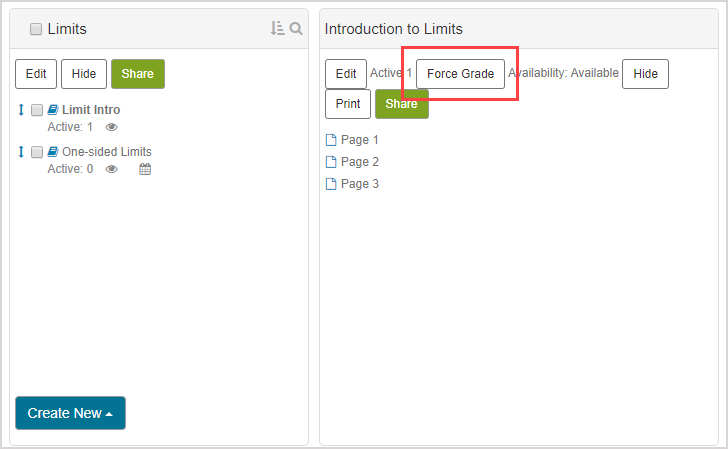 NOTE: If a student has an active attempt at the lesson, you will not be able to edit that student's lesson version in the Lesson Editor. Click Force Grade in the Content Repository to have access to that version of the lesson to edit. However, Force Grade will submit the student's attempt. The Force Grade button is only visible if there are active attempts by students.
