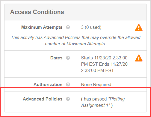 B. Access Conditions — Displays specific activity properties that can impact a student's eligibility to begin their attempt: