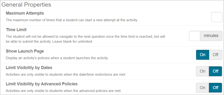 A. Properties — Displays specific activity properties that can impact a student's decision to begin their attempt: