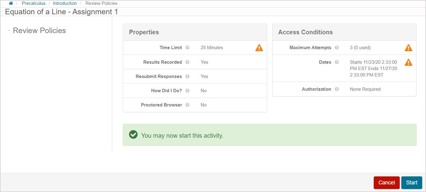 • Example — If the launch page displays a time limit of 25 minutes but the student only has 10 minutes before another commitment, they can decide if they want to begin their attempt or delay their attempt to a later point in time.