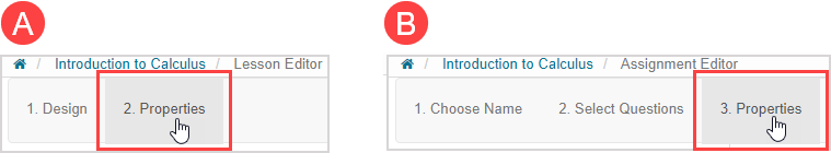 Click the (A) 2. Properties tab in the Lesson Editor or the (B) 3. Properties tab in the Assignment Editor.