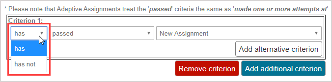 NOTE: Adaptive Assignments treat the passed status as made one or more attempts at.
