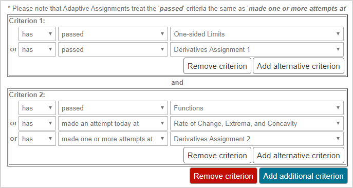 TIP: Delete an alternative criterion by clicking Remove criterion within the desired criterion frame. The criterion listed last in that frame is removed.